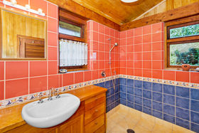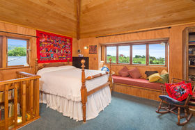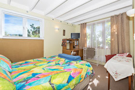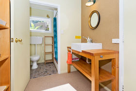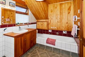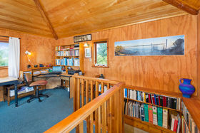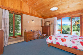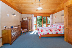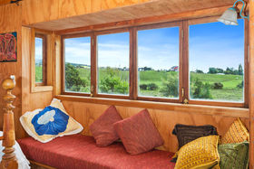 Bedrooms: There are four, inclusive of the sleepout bedroom. The spacious master bedroom with cathedral ceiling has a walk in wardrobe and modern ensuite with colourful tiled wet shower area, vanity and toilet. A second master bedroom and ensuite is the centrepiece of the granny flat occupying the east end of the house (Guest Wing, see below) The upstairs large (25m²) bedroom/study/multi purpose room (accessed by a wooden stairway) has great (4-way) views across the Hunua Ranges to the west, down the coast to the south and out across the Firth of Thames and the Coromandel ranges to the east and north (with wide bay window nook), It is serviced by a toilet and hand basin at the bottom of the stairs.