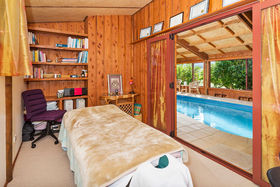 Built in 2010, it has a continuous run of large stacker windows on the north side for passive solar space heating. The pool has a unique EnviroSwim ionisation/oxidation system to avoid the need for chlorination, and a backup gas heater for winter top-ups when necessary. The massage room has a bamboo inlaid ceiling, carpeted floor and is insulated for patient comfort.