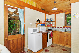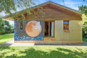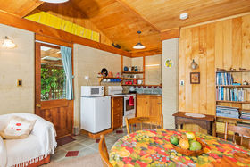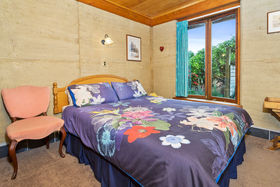 The building has a raised mezzanine area at one end. The sleep-out is well appointed with its own double bedroom and bathroom (complete with shower, toilet and vanity) and an earth wall. There is a modified kitchenette arrangement for guests if they want to prepare breakfast/light meals.