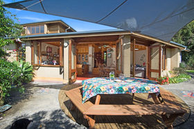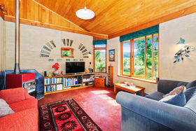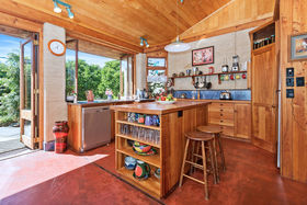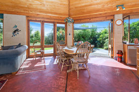 Living Areas: The main kitchen/dining/living area (with cathedral ceiling) on one level faces due north and is bathed in winter sunshine streaming in through 15 glassed window and door panels, and the heat is effectively stored overnight in the thick earth walls and concrete floors. It features a free standing Pyroclassic combustion wood burner plumbed for water heating. This combines with state of the art vacuum tube solar collectors on the roof, resulting in a totally self-sufficient house water heating system.. Two sets of tri-fold French doors open out from the dining area onto a large patio entertainment area and the garden.