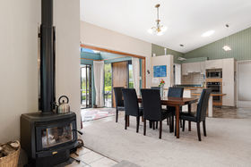 Well-appointed country style kitchen handy to dining and family room. Log fire home heating and solar panel water heating, the cladding Roskill stone and cedar shingle.