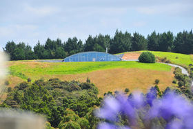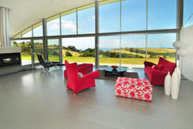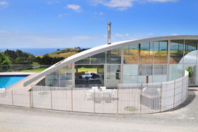 The vast 180 degree panorama afforded by the elevation of the building platform grants a sublime view over the undulating coastal hills and out over the Pacific Ocean.