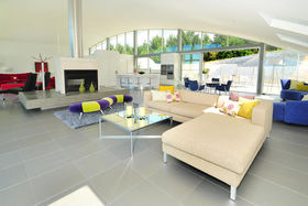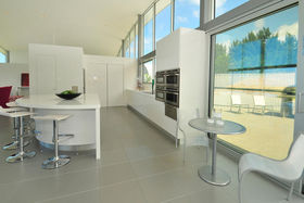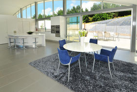 By night, floor mounted LED lighting creates a spectacular luminous effect on the feature walls. The inspirational interior soars to approximately 15 feet at its zenith creating a feeling of even greater space and openness. The ingenious layout of the enormous living areas is flexible and multifunctional allowing furniture to be configured in any number of variations meaning that one need not be restricted by the rigid confines of traditional architecture and design.